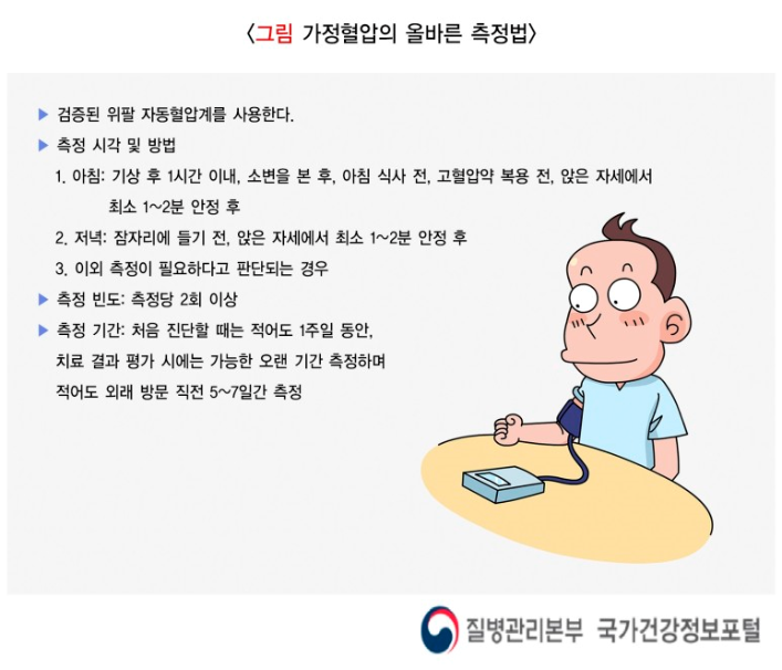 진료실(병원) 밖 혈압의 조절 정도를 평가하기 위해, 환자의 자동혈압계로 직접 가정혈압을 측정하는 것이 필요합니다. 이 결과를 바탕으로 정기 진료 시 현재 혈압 치료 전략을 수정, 보완할 수 있습니다. 가정혈압을 정확하게 측정하는 방법은 아래와 같습니다.